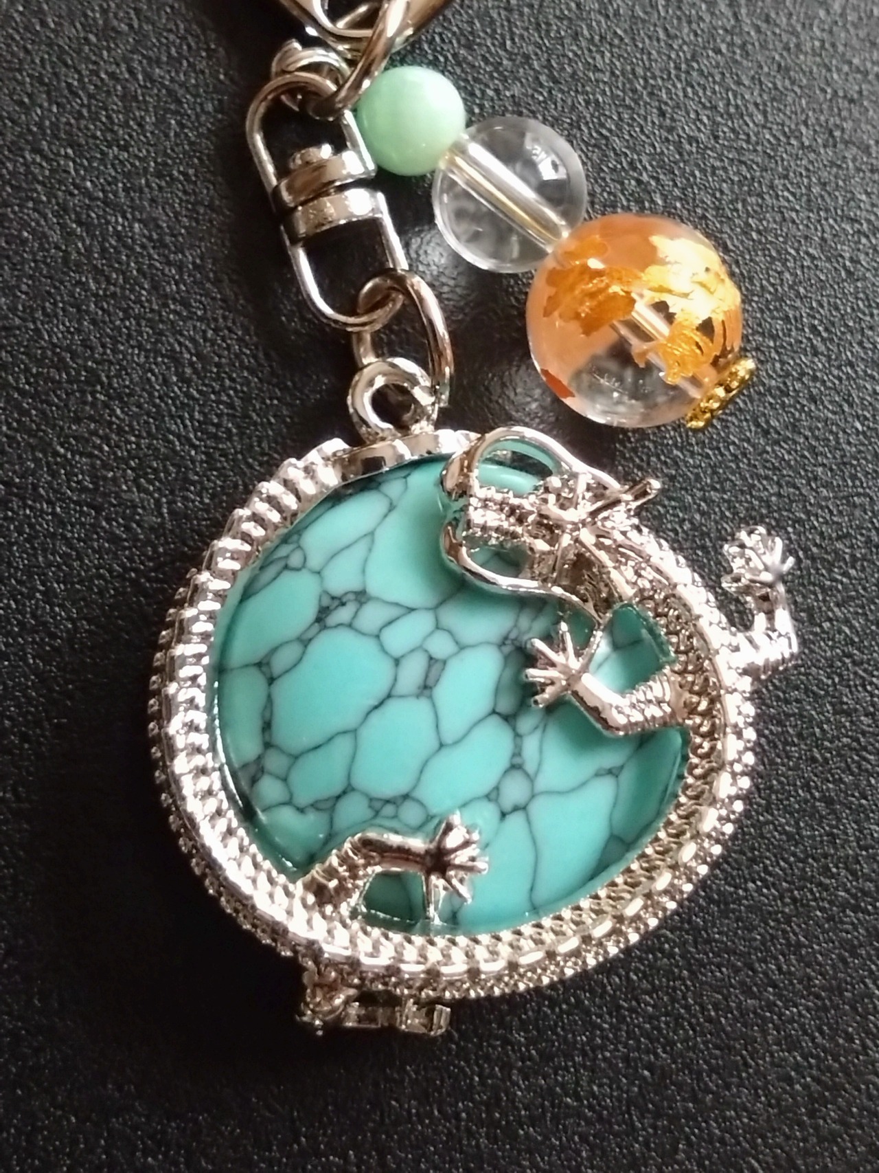 石を抱いた龍に、龍神水晶、沢山の神社にてエネルギーを頂いた水晶、アマゾナイトをつけました。